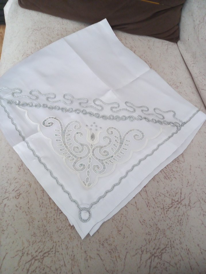Gri nakışlı desenlere sahip beyaz masa örtüsü, klasik tasarımı ve zarif detaylarıyla sofranıza şık bir dokunuş katıyor.