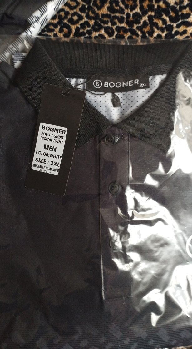 Bogner marka, siyah renk, dijital baskılı erkek polo yaka tişört, 3XL beden. Klasik yaka ve düğmeli kapanışa sahip, sade sokak stili için uygun.