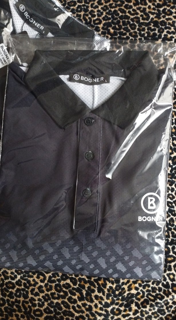 BOGNER markalı, düğmeli yakalı, baskılı desene sahip siyah erkek polo tişört, rahat ve şık sokak stili için ideal.