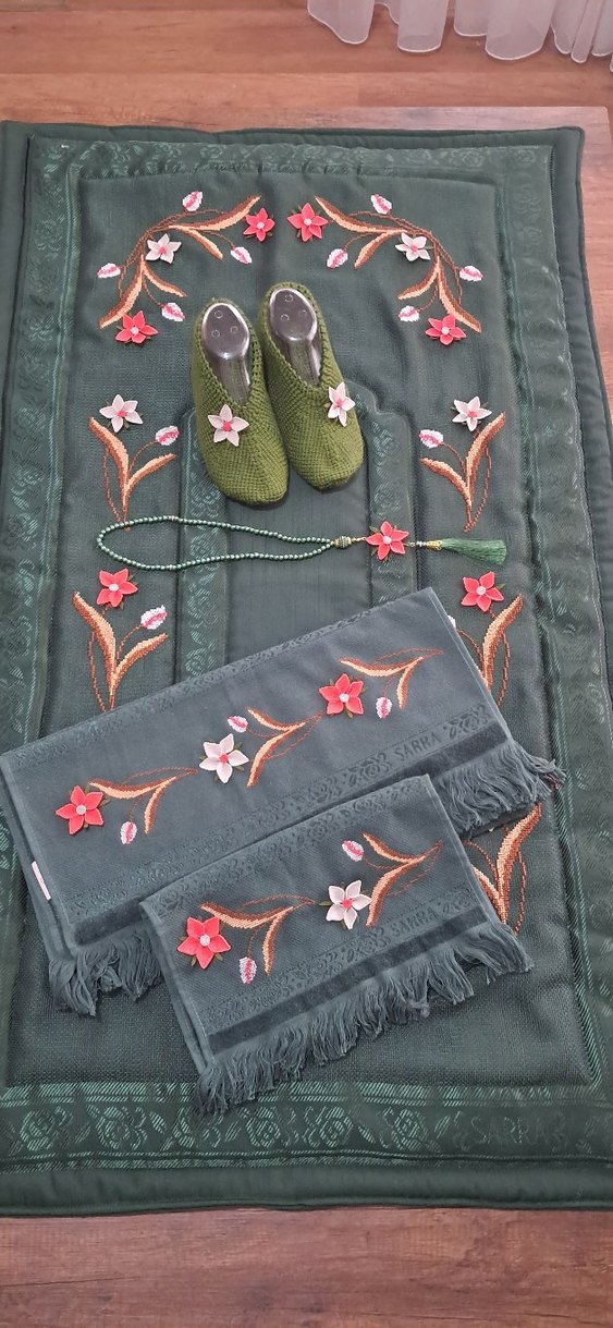sarra seccade, iki havl, patik ve tesbihten oluşan set domino iple kaneviçe ve suni ip iğne oyası motifi yapılarak hazırlanmıştır,astarlanmıştır.