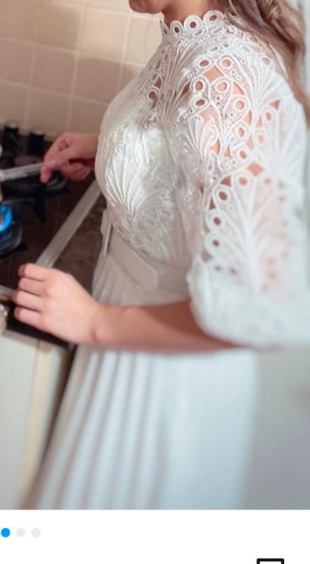 Bu beyaz A kesim gelinlik, straplez yaka ve ince askılı kollara sahip, vücuda oturan bir tasarıma sahiptir. Klasik zarafetle bohem detayları birleştirir.