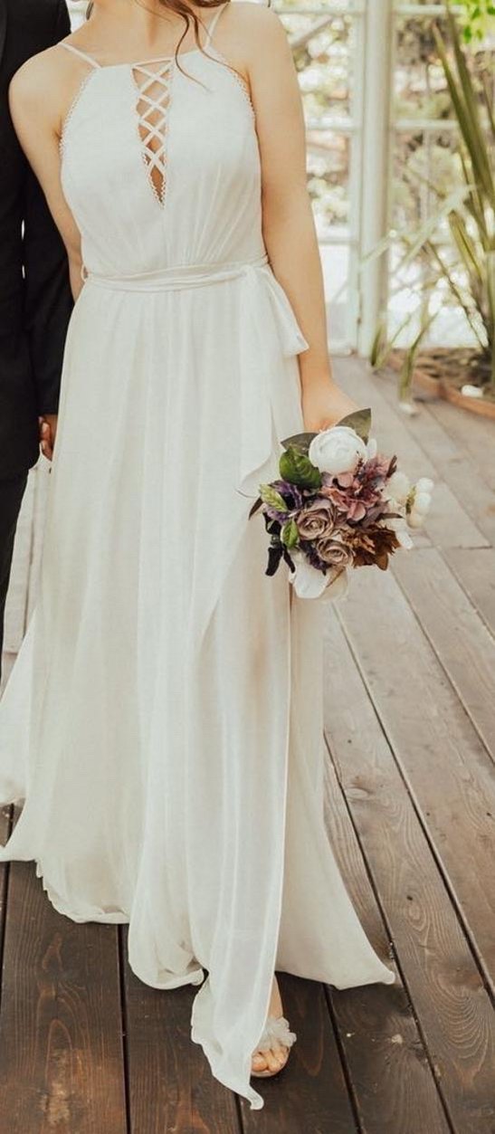 Askılı kollu, straplez beyaz gelinlik, bol kesimi ve bohem tarzıyla klasik şıklığı bir araya getirir. Uzun ve hafif bir görünüme sahiptir. 1 saat kullanıldı önü yırtmaçlı şifon elbise.