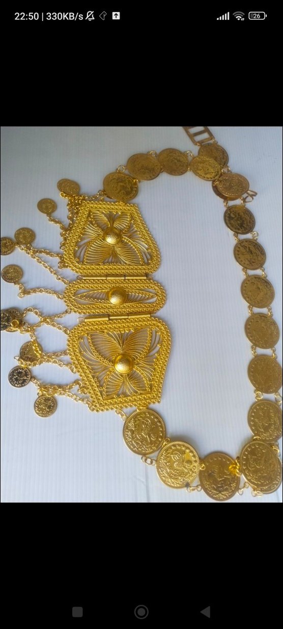 Altın renkli, zincir detaylı ve nakış desenli vücut takısı. Parlak yüzeyi ile bohem ve retro tarzlar için düğünlerde kullanılabilir.