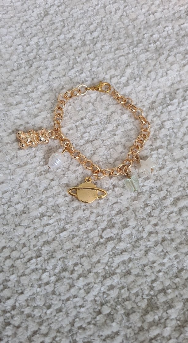 Bohem tarzda, örgü zincir ve nakışlı pastel figürler (gezegen, yıldız, inci) içeren altın renkli bileklik. Günlük kullanıma uygun. ✨