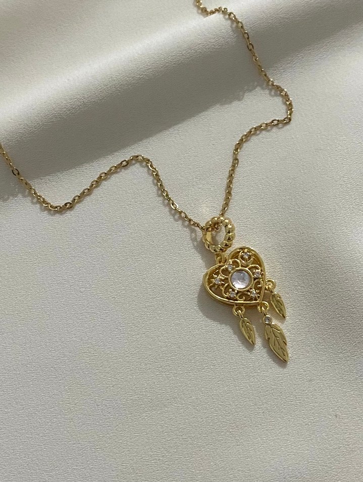 Bohem tarzda, zincir detaylı altın renkli kolye. Nakış desenli kalp şeklinde kolye ucu ve tüy süslemeleri bulunur. Romantik akşamlar için uygun.