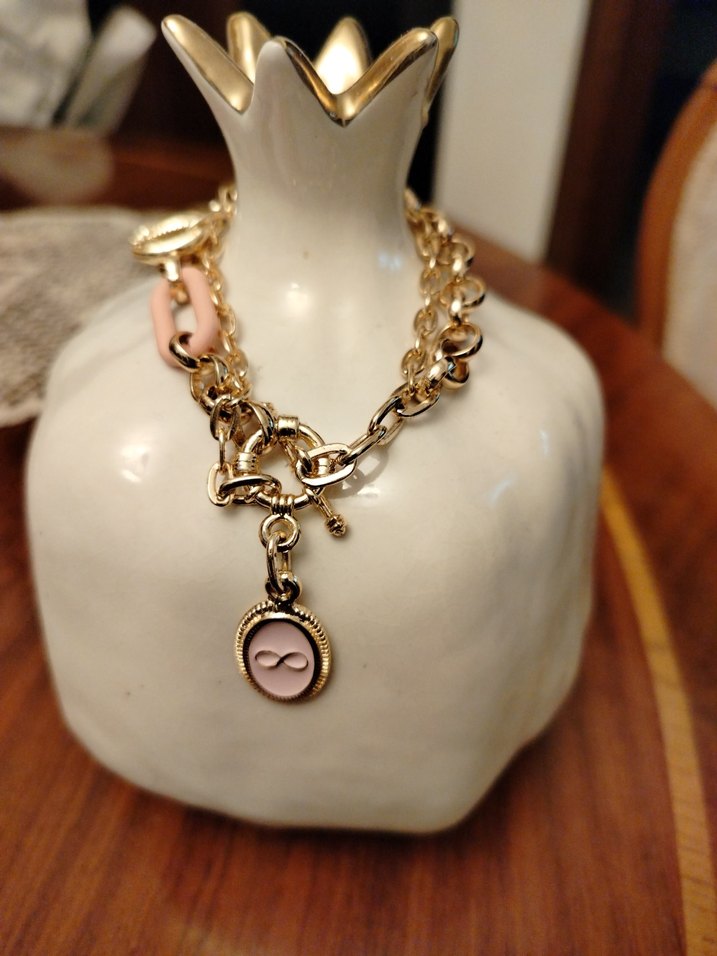 Bohem tarzda, pastel pembe detaylı altın renkli zincirli kadın el zinciri, yılan desenli ve günlük kullanıma uygun.