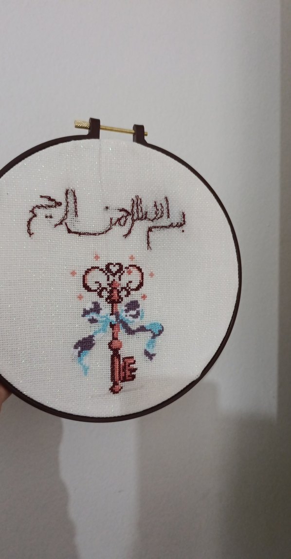 Bohem tarzda, el işi Arapça yazı ve dekoratif anahtar desenli kanaviçe yuvarlak kasnakta kumaş duvar süsü. ️