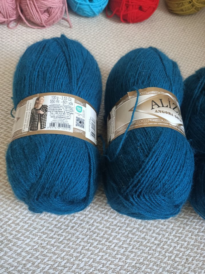 Bohem tarzda, yumuşak dokulu petrol mavisi angora yün iplikten iki top. Her biri 100 gram ağırlığında, örgü ve el işi için uygun.