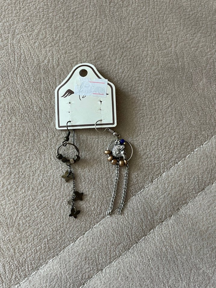 Bu bohem tarz asimetrik küpe seti, gri ve bej tonlarda metal zincirler ve boncuklar içerir. Grunge punk havası katan retro detaylar sunar.