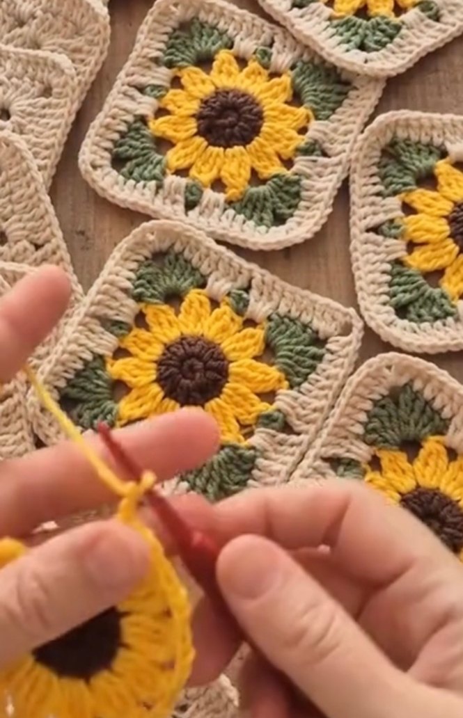 El yapımı bohem ayçiçeği desenli sarı, kahverengi ve yeşil tonlarda örgü kareler.