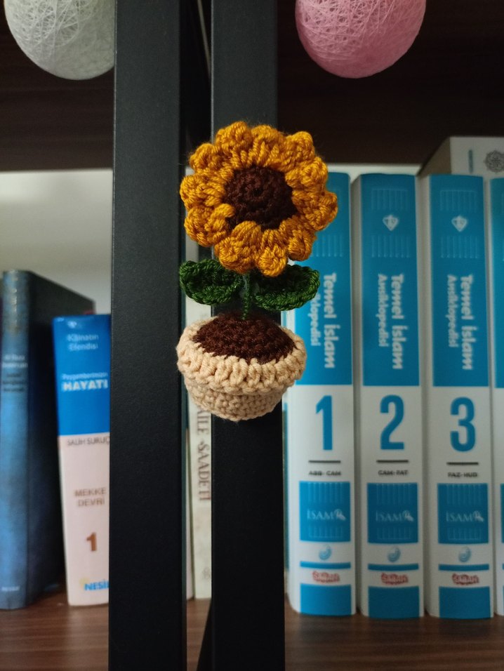 Canlı sarı yapraklar ve yeşil yapraklara sahip küçük saksıda el örgüsü bohem ayçiçeği süs magnet saksı ayçiçeği