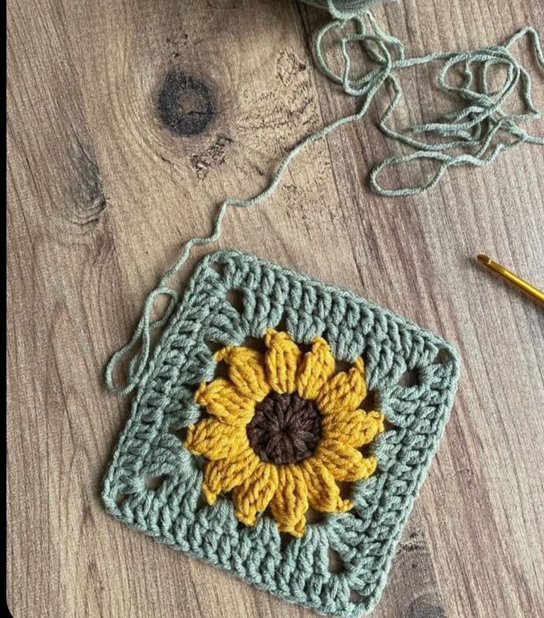 El yapımı bohem örgü kare, yeşil zemin üzerine sarı ve kahverengi ayçiçeği motifi içerir. El işi projelere doğal bir dokunuş katar .