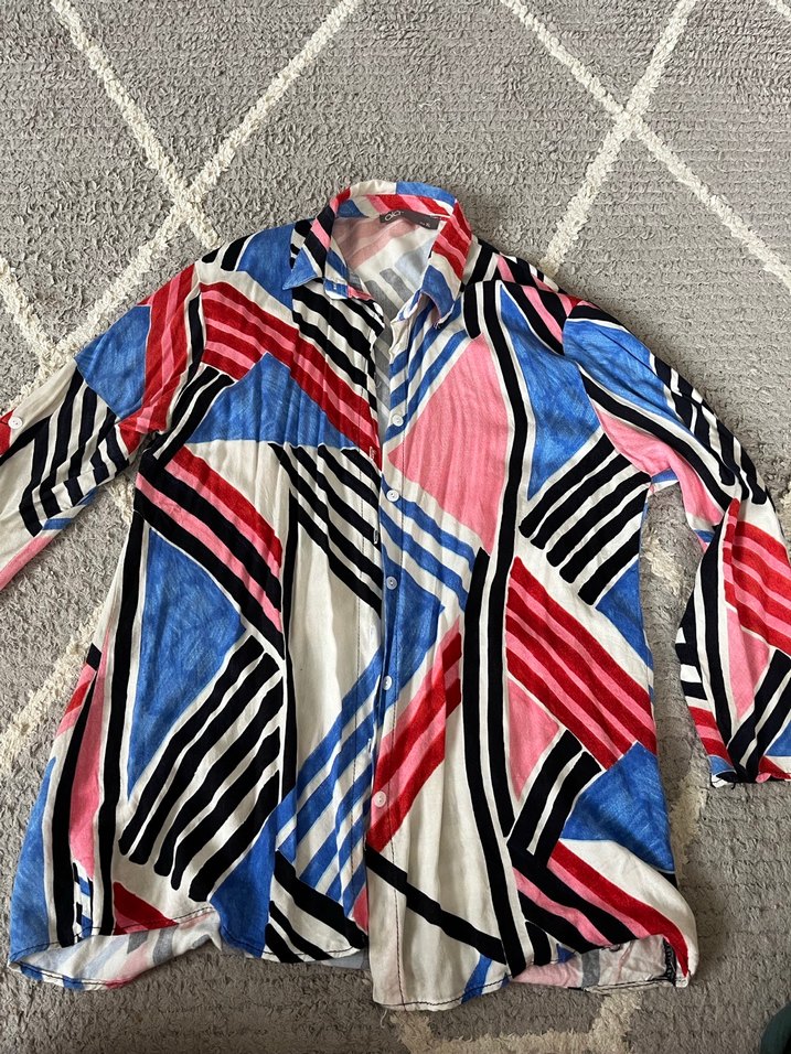 Bol kesim, uzun kollu, yakalı ve düğmeli gömlek. Çok renkli bağlama desenli, viskon kumaştan, bohem tarzını yansıtır. Bir iki yerinde ip kaçması var pamuklu rahat gömlek