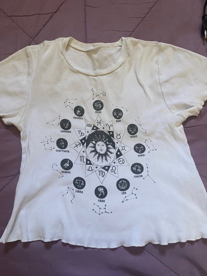 Bohem tarzı burç desenli, kısa kollu, yuvarlak yakalı, beyaz, pamuklu kadın tişörtü. Rahat kesimli ve günlük kullanım için uygundur.