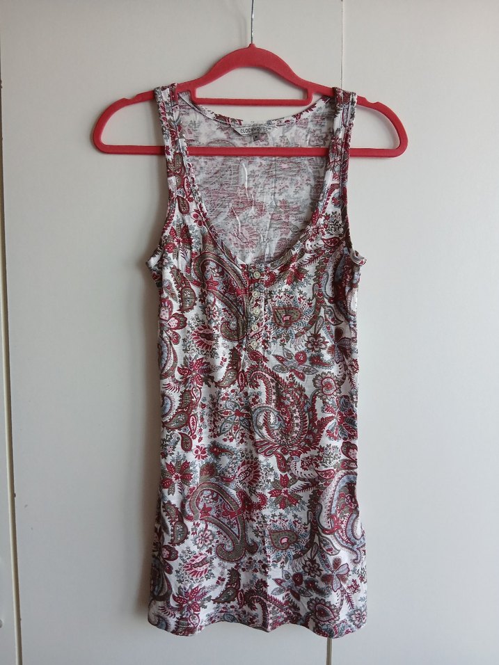 bisiklet yaka, bohem tarzda batik desenli kolsuz tshirt. Gri ve kırmızı renklerde, midi boyda, yumuşak dokulu kumaştan.