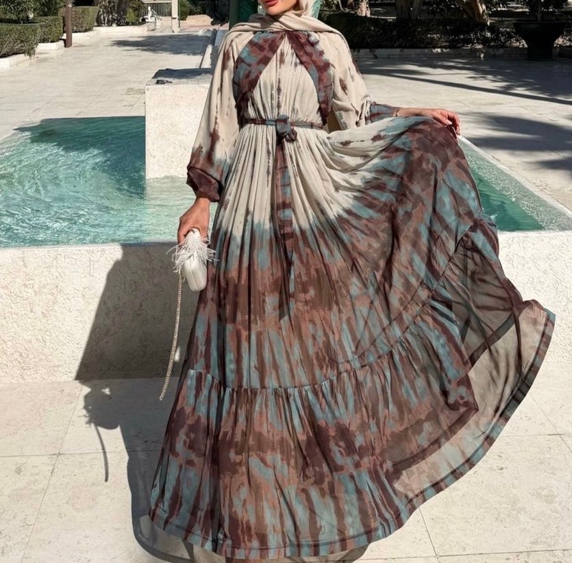 Bohem tarzda, straplez yaka ve askılı uzun elbise. Yumuşak sentetik kumaştan, bol kesim ve batik kahverengi-gri desenli, drapeli tasarım. Günlük kullanım için uygun.