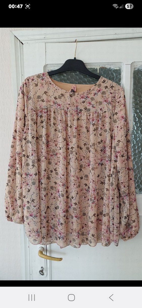 Bohem tarzda, bej renkli, uzun kollu, düğmeli ve pastel çiçek desenli bol kesim bluz. Yumuşak sentetik kumaştan üretilmiştir.