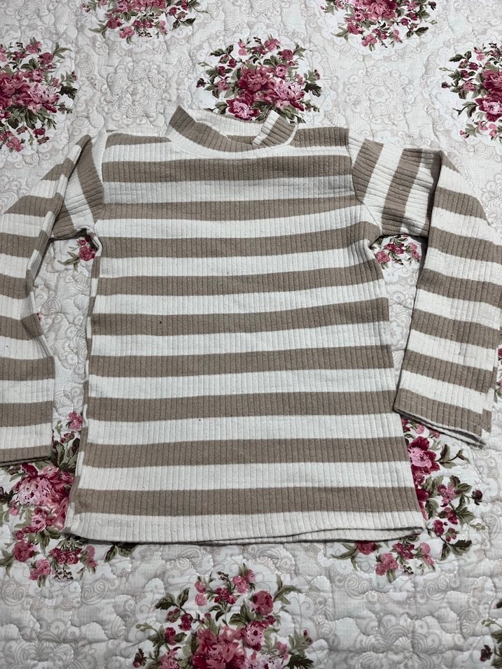 Fıt kesim kadın kazağı, uzun kollu ve boğazlıdır. Bej ve gri çizgili örme kumaştan yapılmıştır. Rahat, sokak stilinde, bohem tarzda günlük kullanım için uygundur.