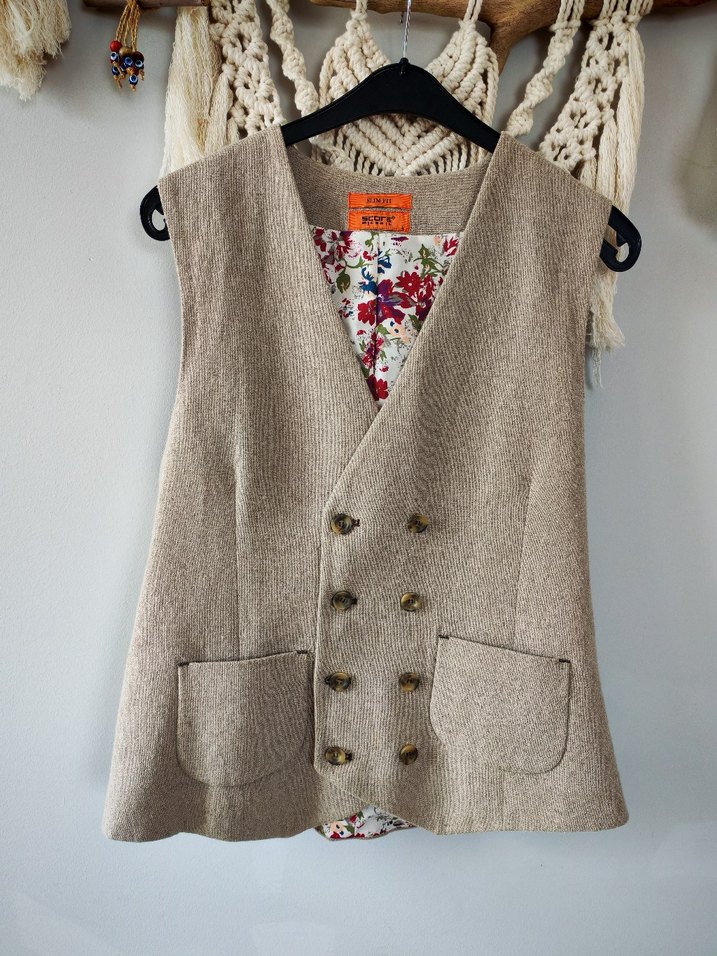 Bej renkli, düğmeli ve nakış detaylı triko yelek. Notlu yaka ve salaş kesimiyle bohem tarzına uygun, kolsuz tasarım.