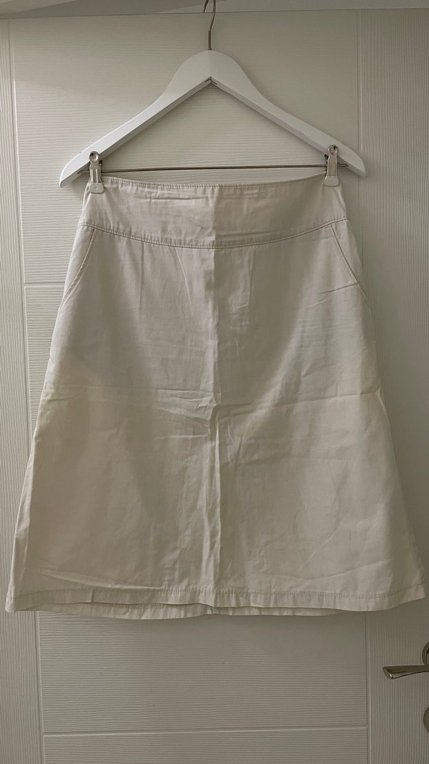 Bej renkte, midi boy ve rahat kesime sahip etek. Yumuşak keten kumaştan yapılmış, minimal ve bohem tarzıyla günlük kullanıma uygun.