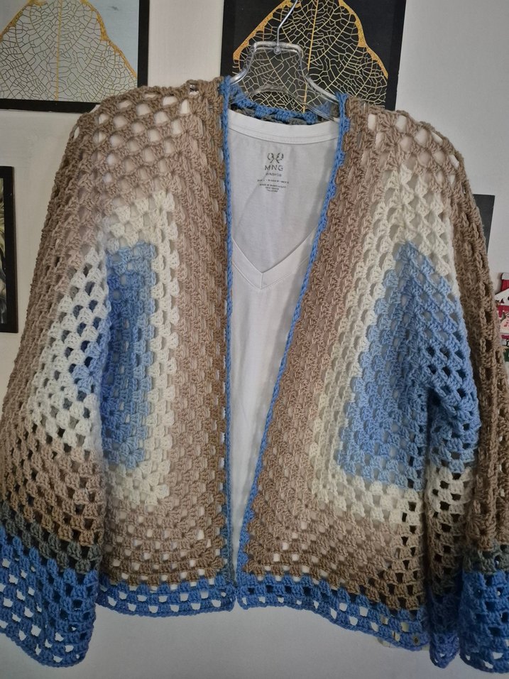 Bej ve mavi renklerde, uzun kollu, tekne yaka, bol kesim örgü kadın hırka. Rahat ve bohem tarzda, günlük kullanıma uygun.