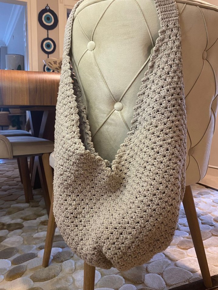 Bej renkli, örgü kumaştan yapılmış bohem tarzda kadın çanta. Günlük kullanıma uygun, rahat ve retro hippie havası taşıyor. gayet büyük kullanisli el emeği kendi ürunlerim