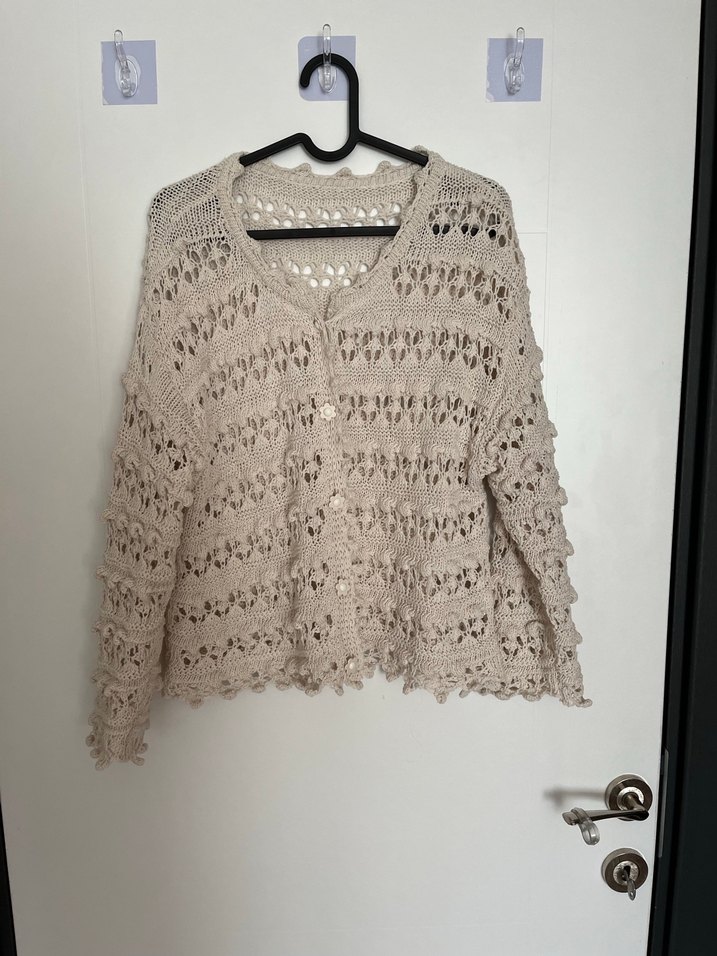 Bej renkte, uzun kollu ve tekne yaka örgü kadın hırka. Bol kesim ve midi boyda, rahat bohem tarz için uygun. Desensiz tasarım. Bir kere kullanıldı bir sorun yoktur beden standart ama 38 beden uygundur bol olsun derseniz 36 beden olanlar alabilir
