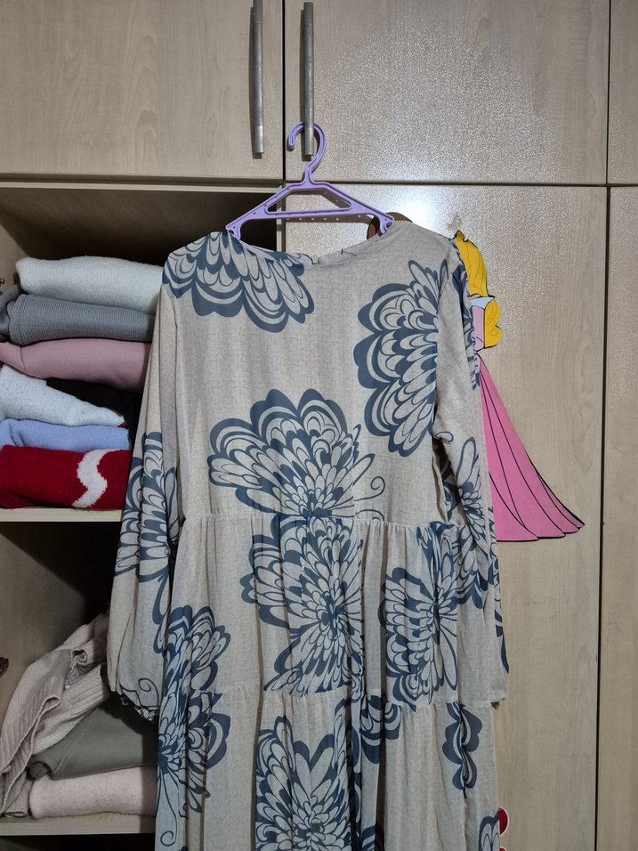 Bej renkte, bol kesim, drapeli ve batik desenli uzun elbise. Yumuşak sentetik kumaştan, uzun kollu ve yuvarlak yakalı, günlük rahat kullanım için uygun. Sıfır ürün hiç kullanılmadı etiketi mevcut değil.