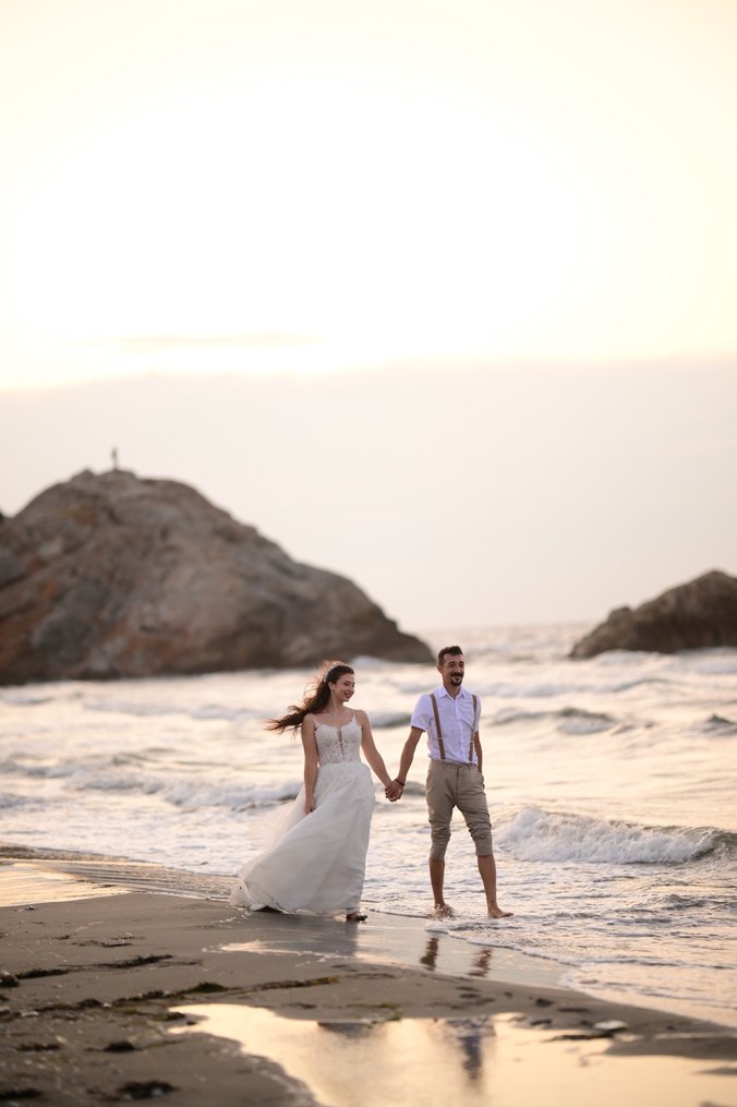 Bohem tarzda, beyaz renkte, A kesim uzun gelinlik. Notch yaka ve ince askılı, klasik ve sade bir şıklık sunar. 165boy 10cm topukluya göre kestirilmiştir. Arkasında 50cm kadar kuyruk bulunmaktadır.