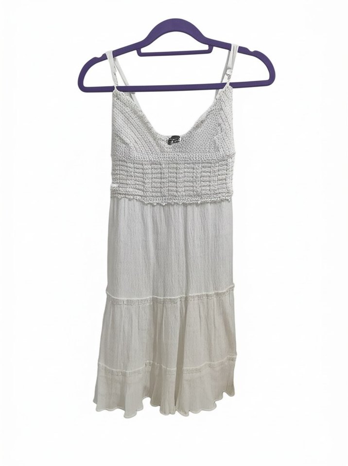 Bohem tarzı beyaz askılı mini elbise, dantel detaylı straplez yaka ve bol kesimle hafif keten kumaştan, ince batik desenlidir. Günlük kullanım için uygundur.