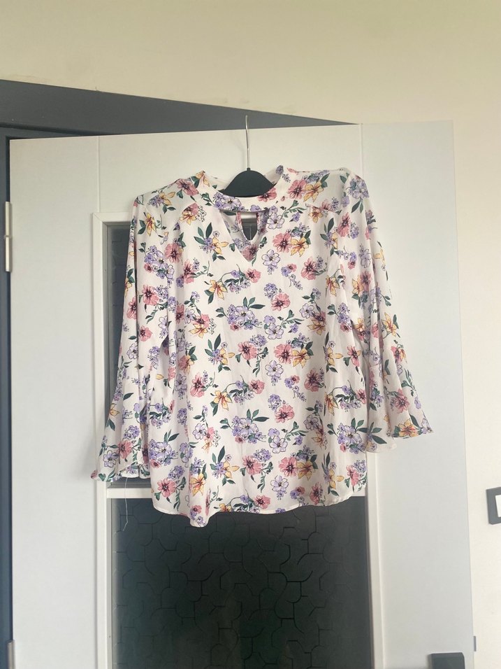 Bu beyaz bluz, V yakalı ve uzun kollu, bol kesimdir. Pastel çiçek desenli ve düğmeli detaylara sahiptir, bohem tarz için uygundur. İki kol arası 51 cm. Omuzdan itibarın boy 62 cm.