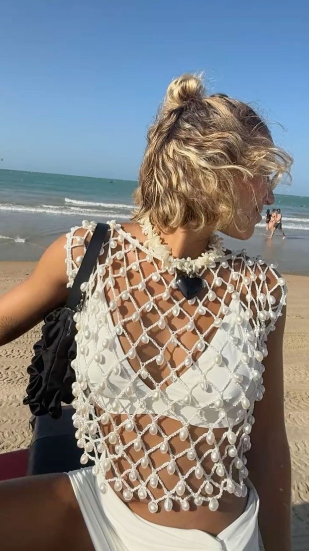 Bohem tarzda, hafif batik desenli beyaz dantel vücut zinciri, plaj için uygun.