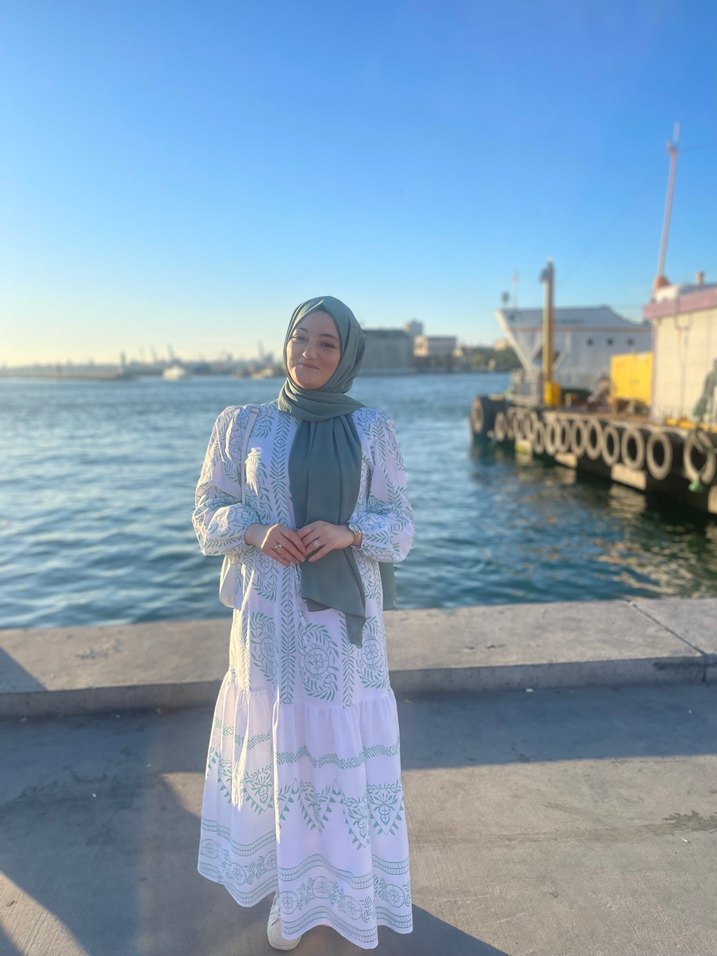 Bohem tarzı, yüksek yakalı ve uzun kollu, bol kesim beyaz bağlama desenli uzun pamuklu elbise. Günlük kullanıma uygun, rahat ve şık.
