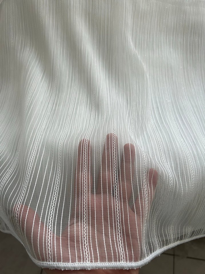 Hafif beyaz, ince dikey çizgili, bohem tarzda yumuşak dokulu tül perde. En 3.00 Boy 1.90 Son 8 adet mevcut Güney Çeyiz Bağcılar
