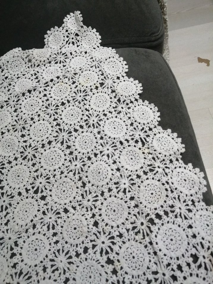 Bohem tarzda, detaylı dairesel desenlere sahip beyaz el örgüsü dantel örtü. Mekanlara şık ve ince bir dokunuş sağlar.