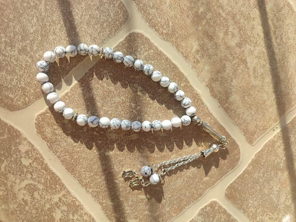 Bohem tarzda gri damar detaylı beyaz erkek tesbih, süslü püskül ile. Rahat bir görünüm için uygun. ️