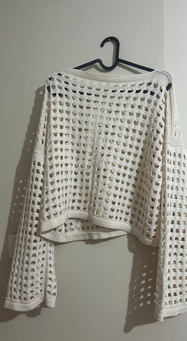 Bu beyaz örgü kadın kazak, bol kesim, uzun kollu ve tekne yaka detaylarına sahiptir. Bohem tarzda, açık örgü deseniyle günlük rahat kullanıma uygundur.