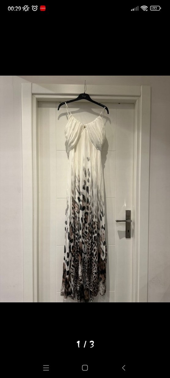Askıli şifon , straplez uzun elbise, dökümlü ve bol kesim. Beyaz ve gri tonlarda tie-dye desenli, sifon kumaştan yapılmıştır. Bohem tarzda, düğün yazlık giyim tatiller için uygun m bedendir