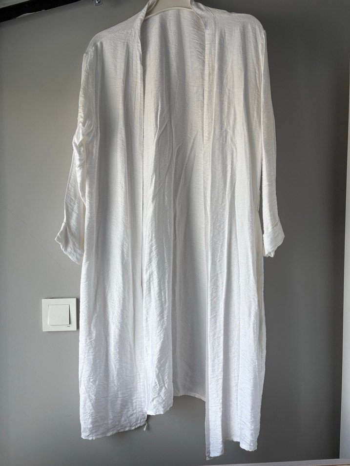 Beyaz bohem tarzda ince ve yumuşak kumaştan yapılmış, desensiz kimono. Rahat kesimi ve konforlu kullanımı ile öne çıkar.