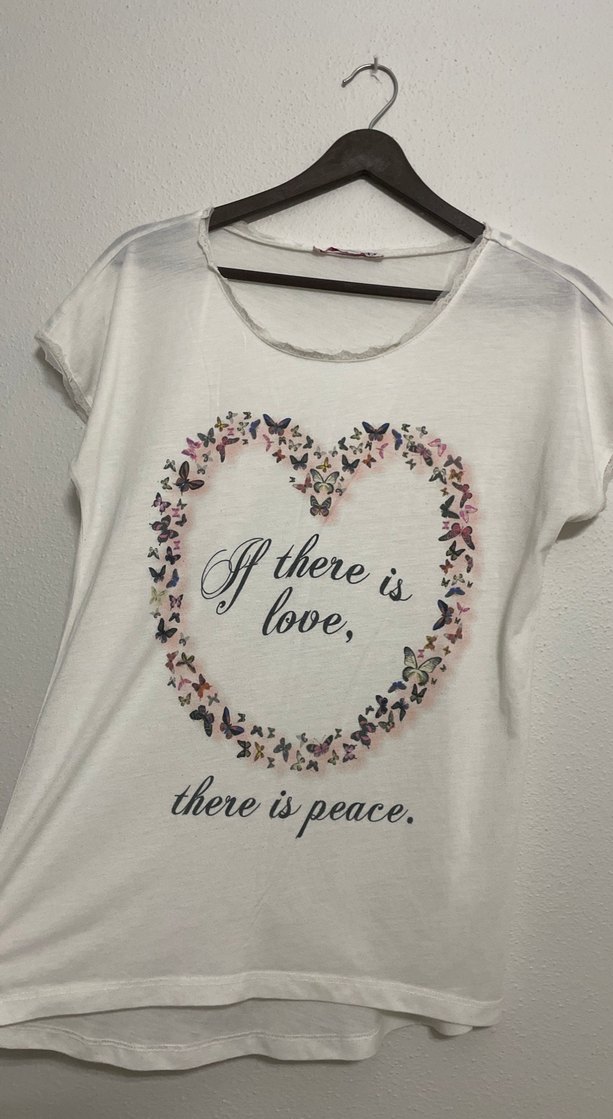 Pamuk kumaştan, kısa kollu, bol kesim beyaz hamile tişörtü. Kelebeklerle çevrili kalp içinde "If there is love, there is peace." yazısı baskılıdır.