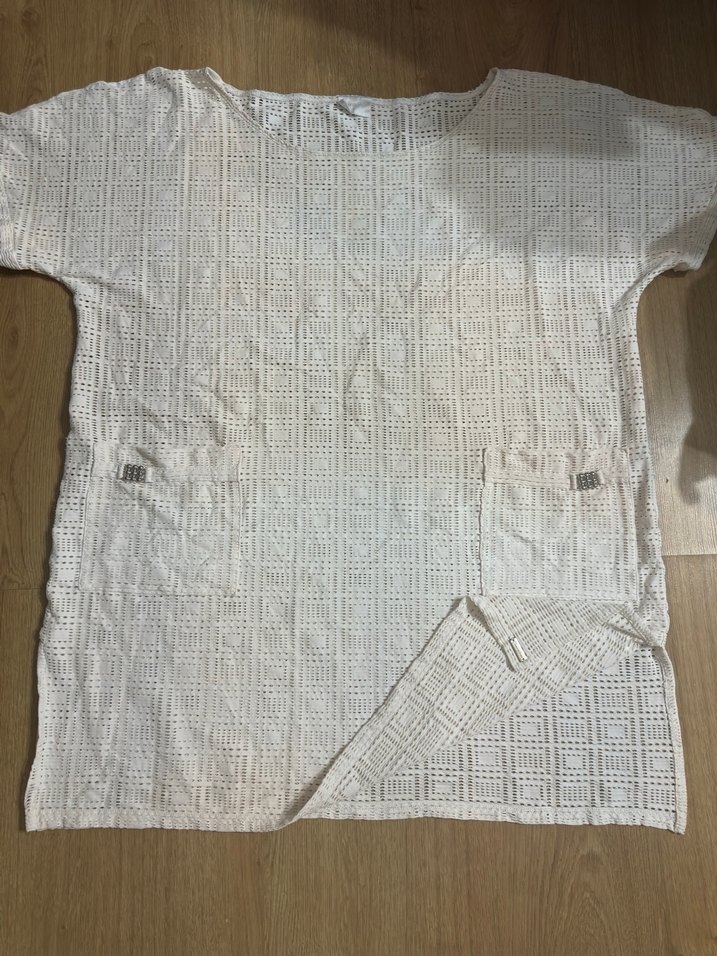 Yumuşak, nefes alabilir ketenden yapılmış bol kesim hamile tunik. Kayık yaka, kısa kollu ve düğmeli tasarıma sahip. Minimalist bohem stil için uygun.