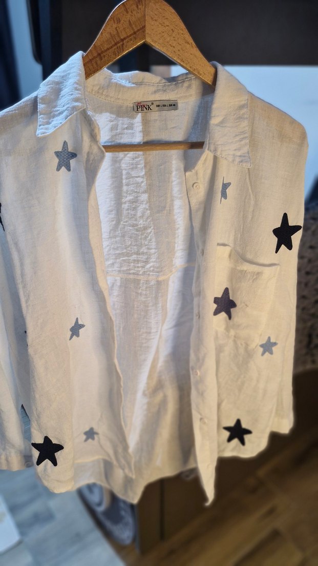 Bohem tarzda, işlemeli yıldız desenli, düğmeli, uzun kollu, beyaz keten gömlek, rahat kesim ve notlu yaka ile.