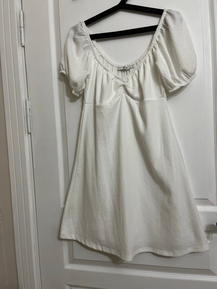 Beyaz keten midi elbise, kısa kollu ve tekne yaka. Rahat kesim, drapeli tasarım bohem tarz için uygun.