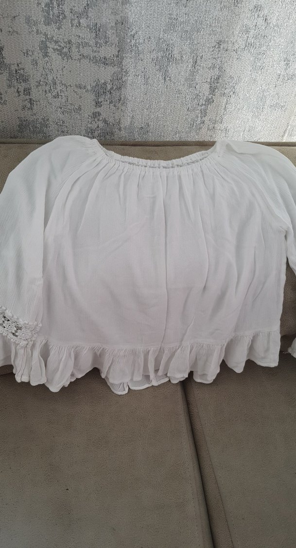 Bohem tarzı beyaz keten mini bluz, kayık yaka ve fırfır detaylı. Uzun kollu, bol kesim ve günlük kullanıma uygun hafif kumaş.