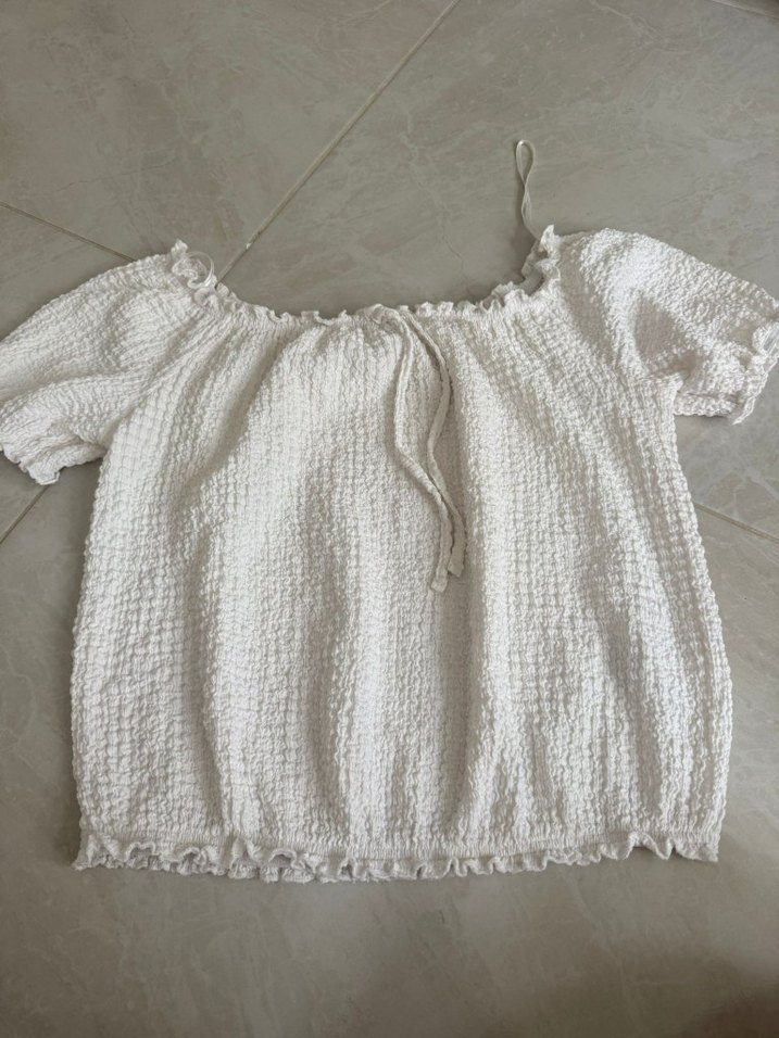 Bohem tarzda, beyaz keten örgü kumaştan yapılmış, kayık yaka ve kısa kollu, bol kesim rahat bir bluz.
