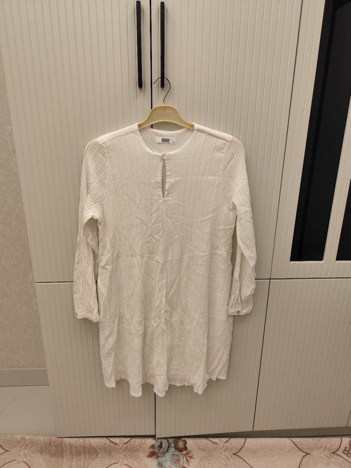 Beyaz keten kumaştan, V yakalı ve uzun kollu, bol kesim midi boy gömlek. Minimalist, desensiz tasarımıyla bohem şıklık sunar.