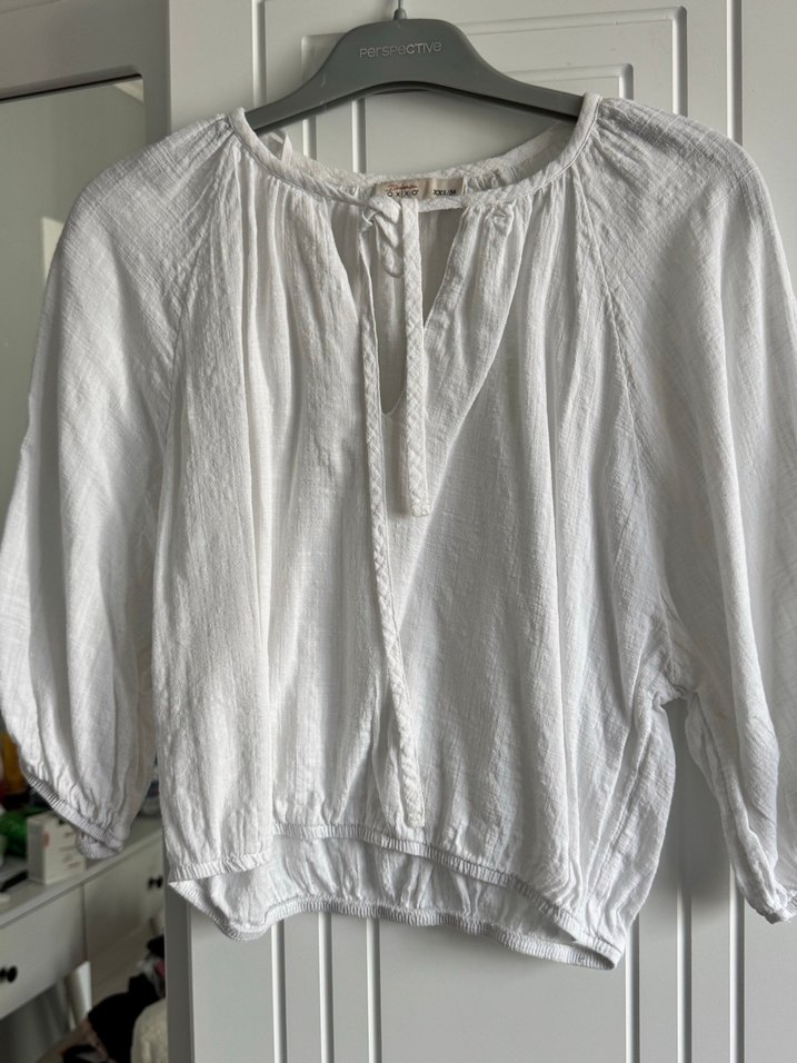 Bohem tarzı, bol kesim beyaz keten gömlek. V yakalı, düğmeli ve uzun kolludur, günlük kullanıma uygundur.