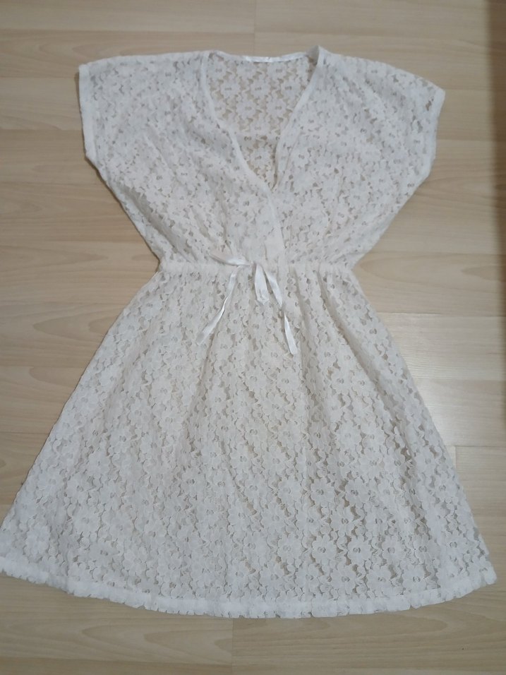 Bohem tarzda beyaz midi dantel mayo üstü pareo, salaş kesim ve kolsuz. Yumuşak dantel kumaştan, sade ve belden lastikli M ve L beden için uygundur.sadece 2 kez giyildi ve yıkandı.sıfırdan farksız