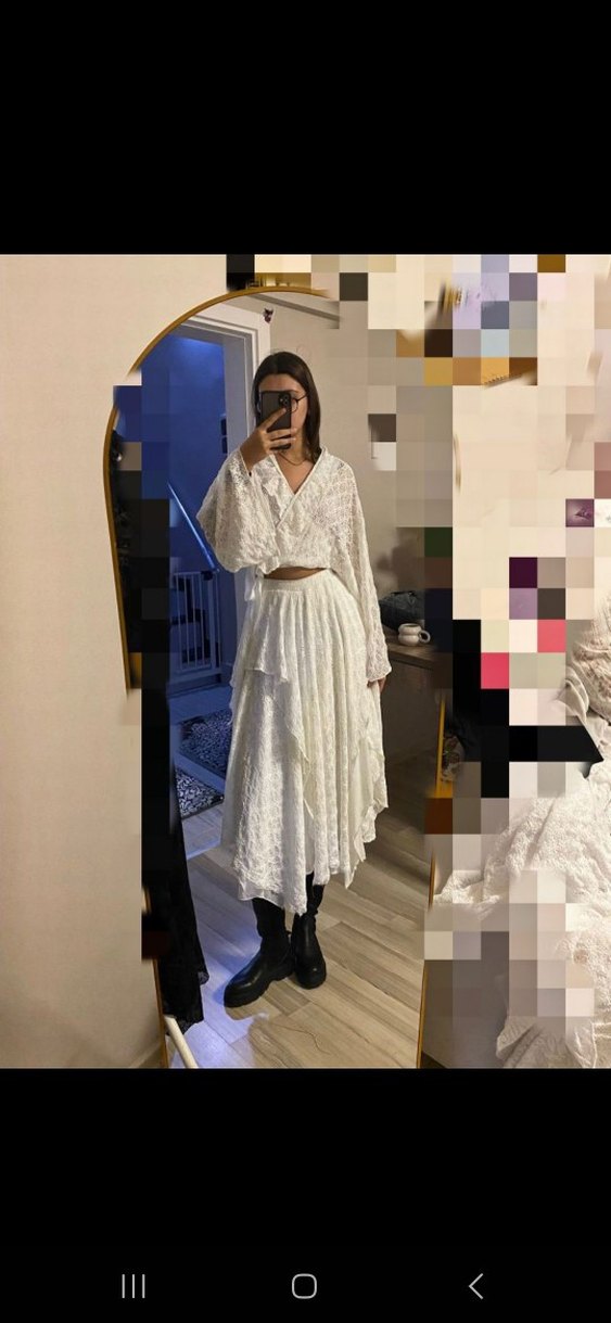 , bol kesim, uzun drapeli kollar ve V yakaya sahiptir. Sadece üstü gönderiyorum etek gönderilmiyor. , günlük kullanım için uygundur.