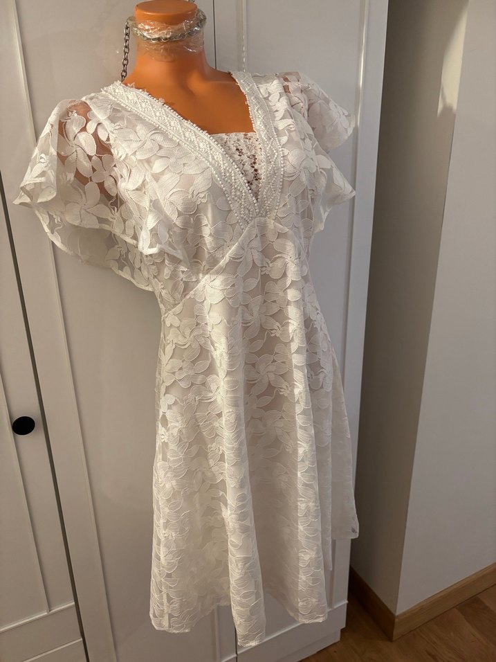Sayılı kullanılmış ve yıkanmıştır, Machek markasının zarif ve modern bir tasarımıdır. Beyaz, astarlı, dantelli, midi boy bir model. Yaka detayı sayesinde feminen ve şık bir siluet. Danteli, fermuar sağlam, astarlı, göğüs kısmında dekolteyi kapamak için içten dantel parça dikilmiş ama sökülebilir. Esnek, polyester, yıkanabilir ütü istemez. Beden 38, göğüs 94, bel 80, etek 55, uzunluk 92 cm. Plastik manken 34 beden 82-58-82 cm. Herhangi bir sorunu yoktur. Bohem tarzda, V yakalı, kısa kollu, bol kesim beyaz mini elbise. Çiçekli dantel detayları ve midi boyuyla şık ve rahat bir seçimdir.